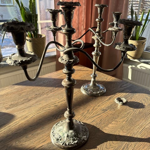 &Tradition ljusstakar i metall och en dekorationsfigur som är ljusstake Ljusstakarna har en detaljerad design med tre ljushållare vardera. Dekorationsfiguren föreställer en sittande figur som bär en kula på huvudet. Produkterna är avsedda för inomhusbruk och kan användas som dekorativa element i hemmet. Figurens H 32 cm, ljusstakar H 20 cm. Pris för en figur 90kr, 2 ljusstakar 250kr.