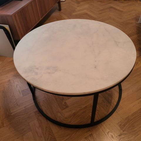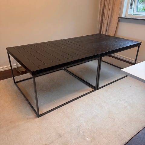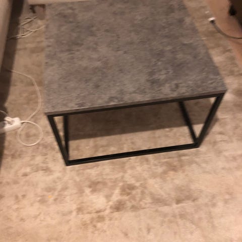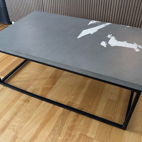 Soffbord Shanghai från Mio. Skivan har en del märken och en skada i ett av hörnen (se bild). Gediget underrede som kan användas till annan bordskiva.