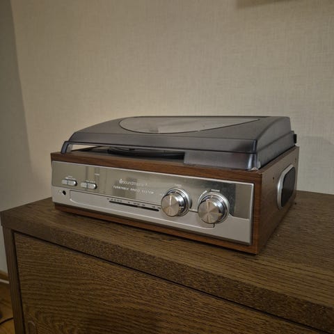 Uppspelning: Den har en skivspelare med tre hastigheter (33/45/78 rpm), en CD-spelare, FM/MW-radio och en kassettbandspelare.