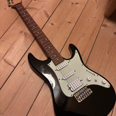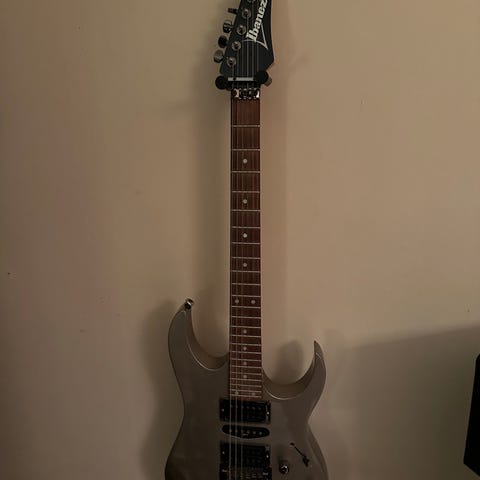 Ibanez RGA42FM elgitarr med blå finish. Gitarren har en kropp med flammig design och är utrustad med två humbucker-pickuper. Den har en sexsträngad hals och en fast stallbro. Passar för olika musikstilar och spelare som söker en elektrisk gitarr med tydlig ton och modern design. Några små märken - se bilder. Lättspelad och skön att spela på.