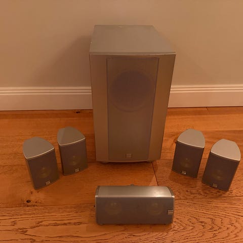 Jag har knappt använt systemet och inte haft det monterat sedan jag flyttade senast. Väggfästen till satelliter ingår, finns nog en del högtalarkabel också.