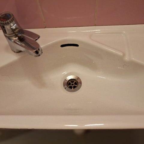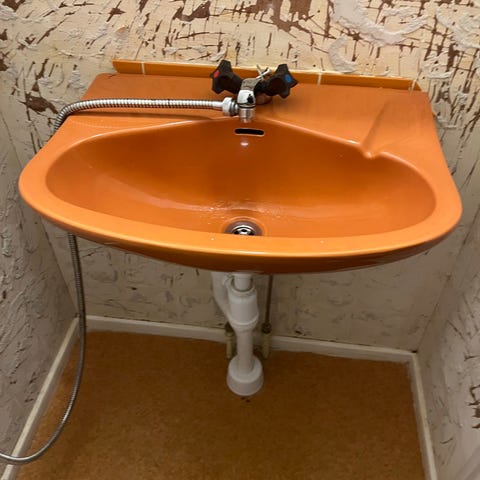 Grön toalettstol med vit sits och matchande grön handfat i retrostil. Toalettstolen har en rundad design med cistern och sits i vitt. Handfatet är väggmonterat med en kran och avrinningshål. Båda produkterna är av keramiskt material och passar för badrum i äldre eller retroinspirerad inredning.