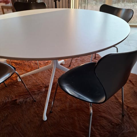 Ovalt vitt matbord med 4 svarta stolar