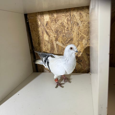Två duvor med svart-vit fjäderdräkt och fjäderklädda fötter. Fåglarna har unika mönster och är placerade på en vit hylla med träbakgrund. 500kr st