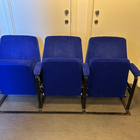 Två fåtöljer med mittkonsol. Fällbara med utskjutbart stöd. Ca 10 år gammal, men sporadiskt använd i biorummet.