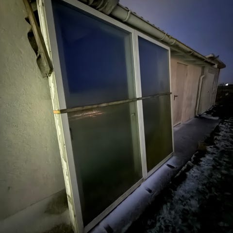 1 st dubbeldörr utan glas i trä, och 8 st fasta partier med öppningsbara fönster ( inga glas ) bestående av flera delar inklusive dörrar och fönstersektioner. Dörrar och fönster har flera glasrutor och är av naturfärgat trä. Passar för installation i uterum eller orangeri . Mått B 1020 H 2210
