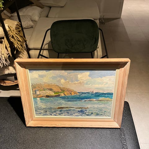 Oidentifierad landskapsmålning i olja med motiv av träd och hav. Inramad i en träram med flera färgade lager. Passar för inredning och samlingar.