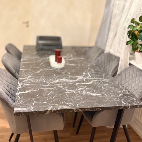 Fint robust matbord med 8 st klädda stolar. Går att sitta 10 pers. kring bordet.