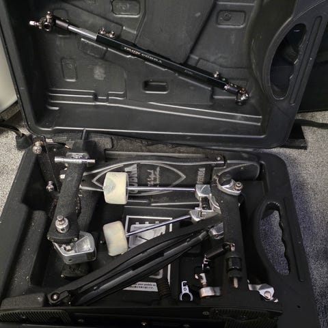 Dubbelpedal Premier inklusive filtklubbor, träklubbor samt trumnyckel. Hämtas i Karlstad.