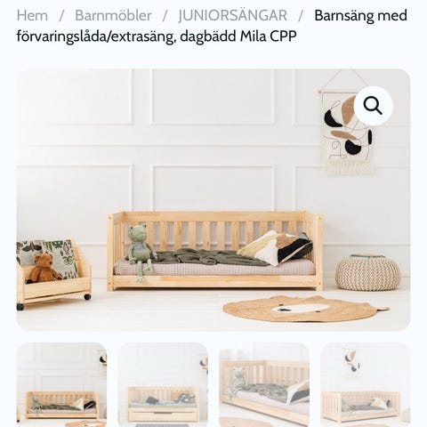 IKEA säng i vit färg med tre förvaringslådor under sängen. Sängen har ett skyddsräcke monterat på ena sidan för ökad säkerhet. Passar för barn och vuxna. Sängen är tillverkad i trämaterial.