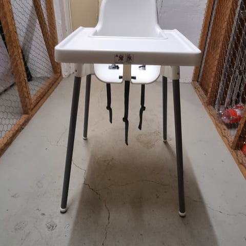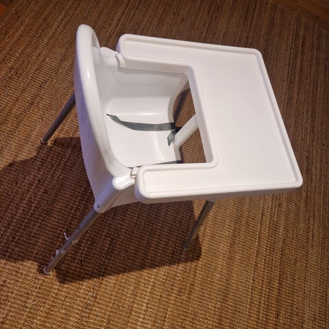 Antilop med bordsdel som köpts separat och sätts på direkt på stolen har kommit till stor nytta - och den är så underbart lätt att torka både tomat och i torkad mat ifrån! Spänne enbart runt midjan (inte mellan benen) som går att justera i längd. Benen har två vita och två röda "pluttar" längst ner, vilket gör de synliga och lättare att inte snubbla över, alternativt mer diskreta om man önskar det. Använt skick som går att användas i många år till.