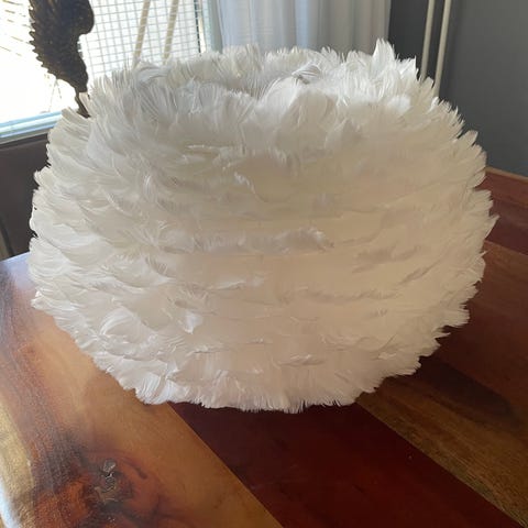 Lampan är tillverkad av vita gåsfjädrar och papper . Lampan gör sig utmärkt i de flesta rum och ger ifrån sig ett varmt och stämningsfullt sken när den är tänd!