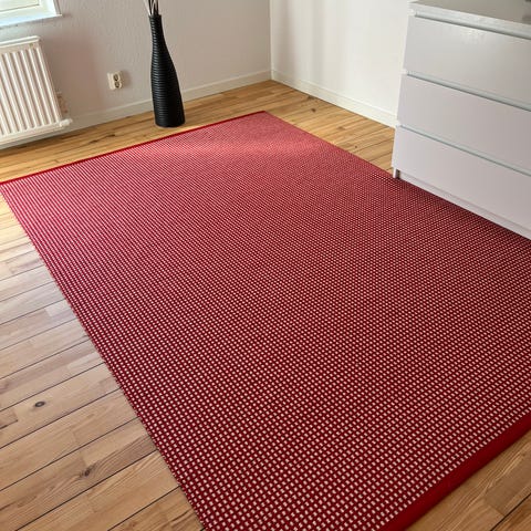 Säljer en superfin röd matta med vita prickar i väldigt bra skick, 170x170 cm.