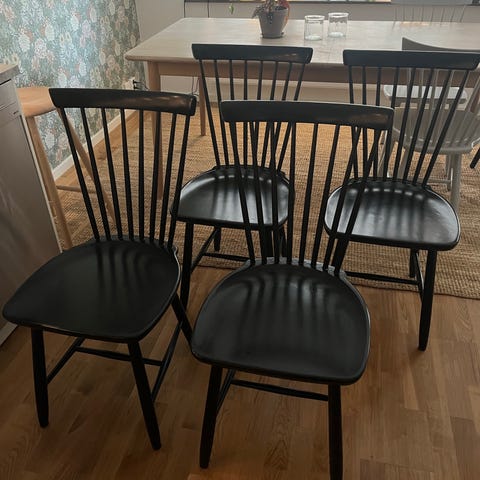 Barpallar (Knappen), 4 st, i massiv björk med svartlaserade ben av Marit Stigsdotter för Stolab. Höjd 65 cm, bredd 40 cm.