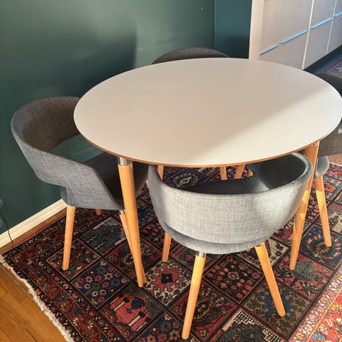Bordet är 100 cm diameter och passar bra att sitta fyra runt bordet. Eftersom de bara är ett ben går det även att trycka in en till två till om man vill.