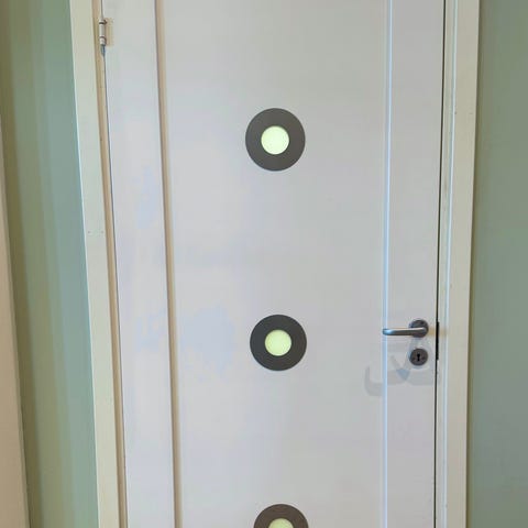 Vit innerdörr med speglar i trä.
