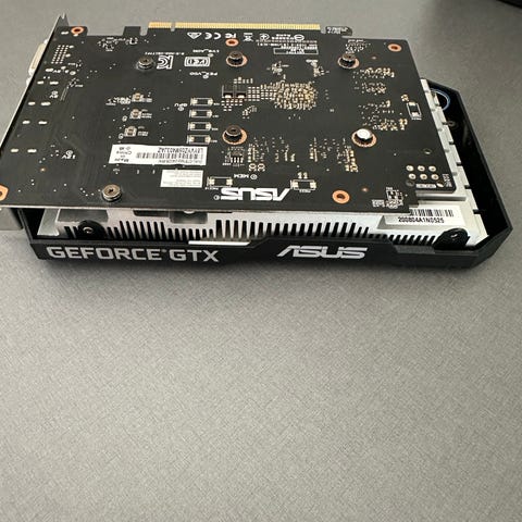 ASUS TUF Gaming GeForce GTX grafikkort med dubbla fläktar och bakplatta. Grafikkortet har flera anslutningar inklusive HDMI och DisplayPort, och är designat för datorer med PCIe-gränssnitt.