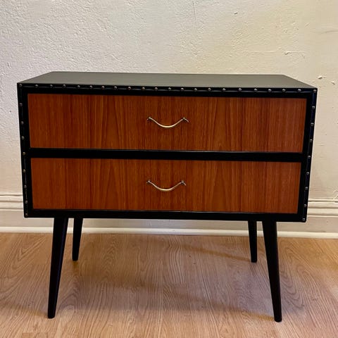 Liten byrå/sängbord/sidobord i teak i perfekt skick. Nätt med två lådor. Se mått.