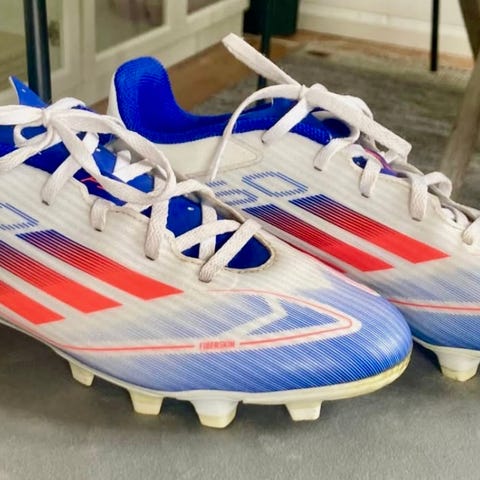 Adidas F50 fotbollsskor i färgerna vit, röd och blå. Skorna är designade för fotboll och har snörning fram. De är tillverkade i lätt material som passar för sportaktiviteter.