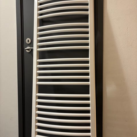 Handdukstork i kromat stål med flera horisontella rör för upphängning av handdukar. Monteras på vägg, lämplig för badrum.