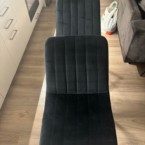 Säljer 4 sammets stolar som är inköpta på Mio. Färgen är svår att få på foto, men färgen är grå/grön. Jag tycker den är mer grå. Bättre att se i verkligheten. Lätta och torka av. Finns i Höör och på flera sidor.