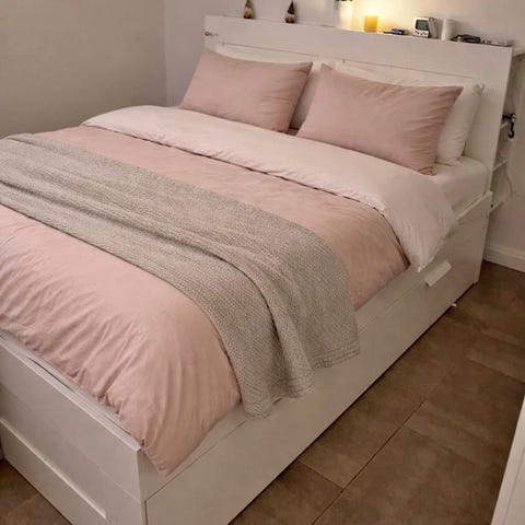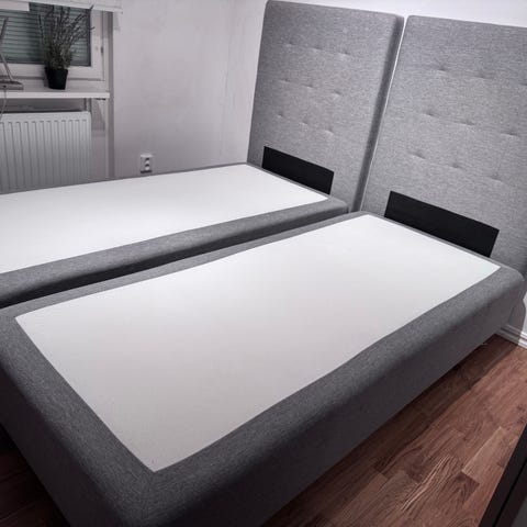 Dubbelsäng med tillhörande sänggavel i mörkgrått. Sängen är från Mio i serien Roma, nypris 12995kr.