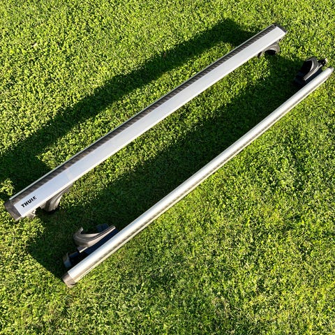 Thule universella lasthållare som passar bilar med rails som har ett mellanrum mot biltaket då hållarna spänner runt railsen.