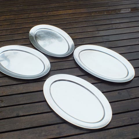 2 st IKEA rostfri stål brickor. Passar för servering och som underlägg för olika ändamål i kök och hem.