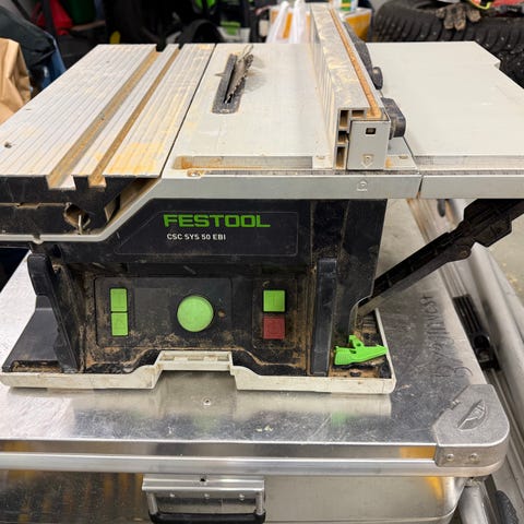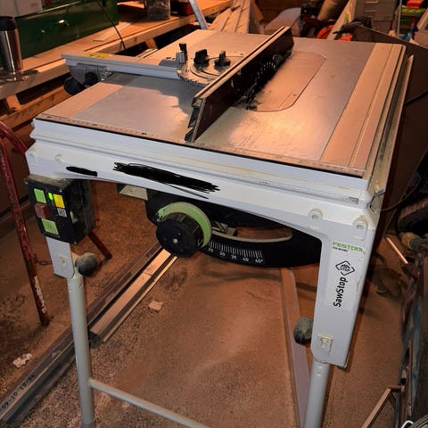 Festool TKS 80 EBS bordsåg med integrerad SawStop AIM-teknik. Utrustad med en robust bordsyta och justerbar styrskena för precisionskapning. Lämplig för professionellt träarbete och snickeri.