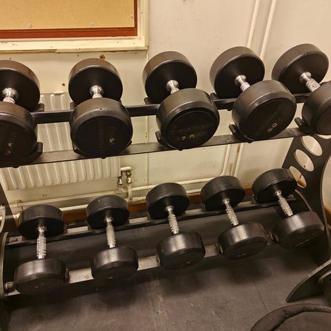 Hantlarna passar dig som mer bryr dig om att de ger resultat än att de ska fungera som inredningsprylar då flera är slitna i gummit och även lite rostiga. Men fullt fungerande och tunga är de ändå så blir du inte stark beror det mer på dig än på vikterna.
