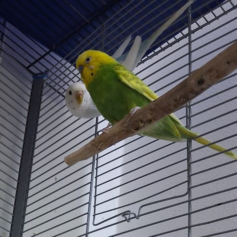 Fåglarna är trygga, man kan utan problem dammsuga och fixa och dona utan att de blir störda av ljud. De trivs i varandras sällskap och är alltid tillsammans, de parar sig, men har ingen holk, än så länge har honan inte lagt ägg.