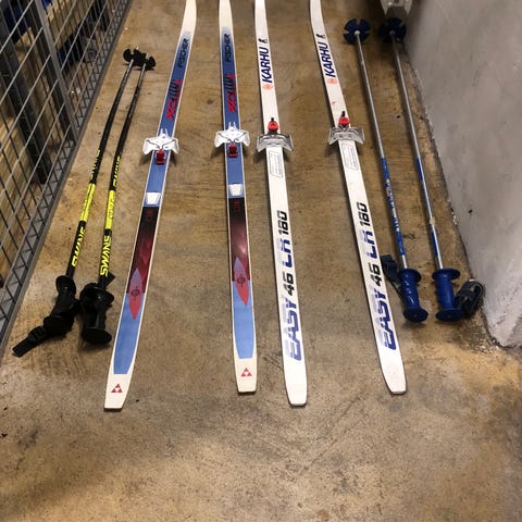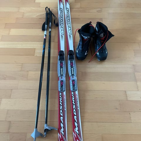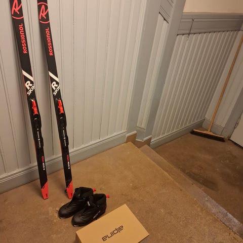 Rossignol skins skidor 120 cm med tillhörande stavar och pjäxor. Rottefella bindning