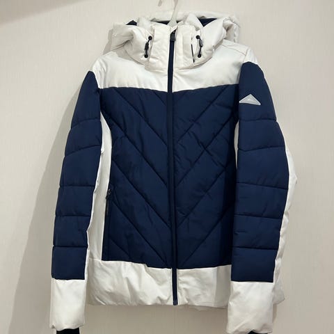 Med muddar vid armslut, ficka för liftkort på ärmen, Snölås runt midjan i jackan.