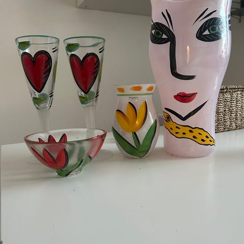Kosta Boda vas Moonflower i blått glas med färgglad dekor.