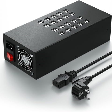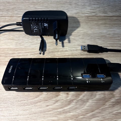 Icy Box USB-hub med 7 portar och medföljande strömadapter. Ansluts via USB och möjliggör utökning av antalet USB-anslutningar på en dator eller annan enhet.
