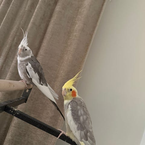 Jag säljer mina två fina nymfparakiter (cockatiels), en hona och en hane, som är mycket fästa vid varandra.