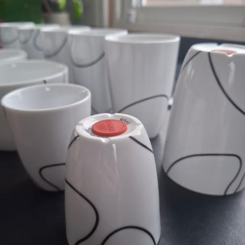 Design av Pernille Vea och tatueraren Alexander Hasnaoui. Man varken bränner sig eller känner av kyla från dessa koppar. Bra skick.