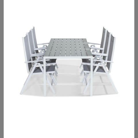 6 st stabila, lätta och stapelbara stolar i vitt aluminium och ljusgrå textilväv. (Mio, Capri Utestol): 1800kr