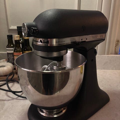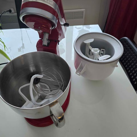 KitchenAid Artisan köksmaskin i röd färg. Levereras med flera tillbehör inklusive ballongvisp, degkrok blandare och två rostfria blandningsskålar i olika storlekar. Maskinen är avsedd för köksanvändning och kan användas för att vispa, knåda deg och blanda ingredienser.