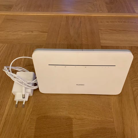 Huawei router med medföljande strömadapter. Enheten är vit och avsedd för nätverksanslutning.