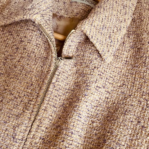 Från ateljé Creation, plagget består av en ärmlös topp och jacka i storlek L, tillverkade i polyester/elastone. Färgen är svart med lila inslag och mönster i texturer. Rosa dräkt i silke, storlek M, använd en gång. Två vita jackor storlek M, den långärmade är i bomull/polyester och den kortärmade är i polyester. En champagne färgad jacka i silke för fest i storlek M.