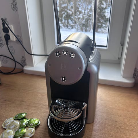 Nespresso CitiZ kapselkaffemaskin med tillbehör inklusive kapselställ, mjölkskummare och instruktioner. Maskinen är designad för att användas med Nespresso-kapslar och är lämplig för att brygga espresso och andra kaffedrycker.