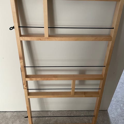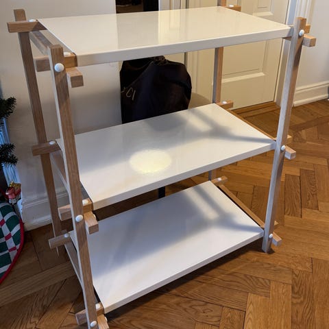 Hay Woody i ek och stål med olikfärgade hyllplan. Färgsättning säljs inte längre. Stabil och välgjord. Repor finns, syns mest på det grå hyllplanet men förekommer på alla hyllplan. Använt skick men verkligen en fin möbel som ger rummet karaktär. Vi har haft den i barnrum. Första bilden lånad