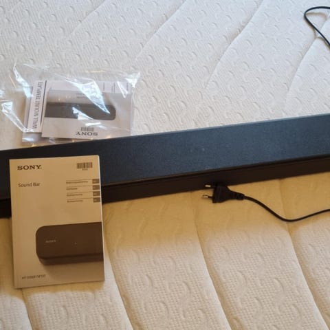 Sony soundbar i svart färg. Ljudenhet avsedd för att förbättra ljudkvaliteten från TV eller annan ljudkälla. Enkelt gränssnitt med knappar för volym och funktioner. Sladdanslutning för strömförsörjning.