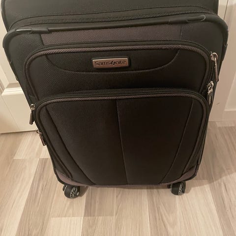 Samsonite-resväska i plast. Låsbar och utrustad med hjul och bärhandtag. Invändigt finns korsremmar för att hålla innehållet på plats.