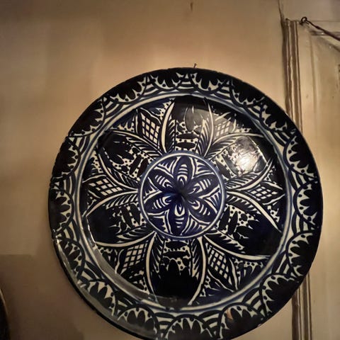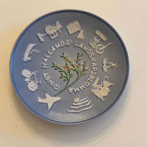 Det finns ett mindre nagg i kanten samt visst slitage i guldkanten (se bilder). När tallriken hänger på väggen påverkar detta helhetsintrycket minimalt.