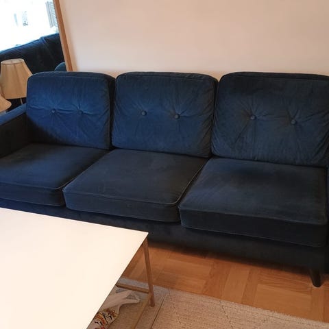 Säljer 2 st sammet soffor 3 sits i mörkblå färg