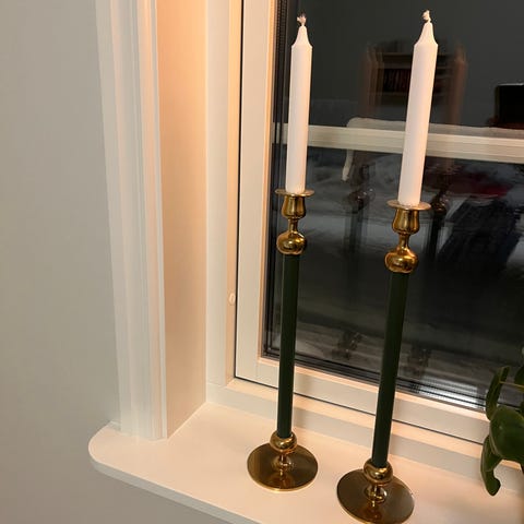 Ett par Svenskt Tenn Ljusstakar med mässingsmanschett designad av Josef Frank . Ljusstakarna har en svart bas i trä och en manschett i mässing.