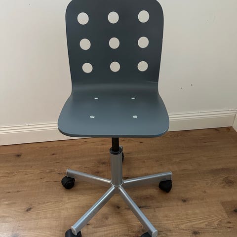 Välanvänd skrivbordsstol från ikea i mindre storlek för junior. Höj och sänkbar. Diverse märken som kan ses exempel av på bilder.