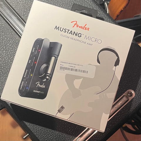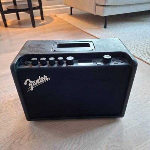 Sonen säljer sin Fender Mustang IV gitarrförstärkare med flera reglage och inställningsmöjligheter. Pedal medföljer.